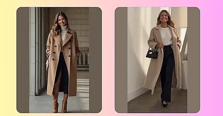 Hey there, fashion friends! November’s got that chilly vibe, but that doesn’t mean your style has to hibernate! This picture shows a super stylish outfit perfect for those cool autumn days. Imagine strolling down the street, feeling all warm and snug in that gorgeous camel-colored coat, while still looking totally put-together. It’s like a hug for your body and a boost for your confidence. Think cozy, but make it fashion! That cream-colored pantsuit underneath is the secret weapon – it’s effortlessly chic and comfy enough to wear all day long. Who needs sweatpants when you’ve got this?