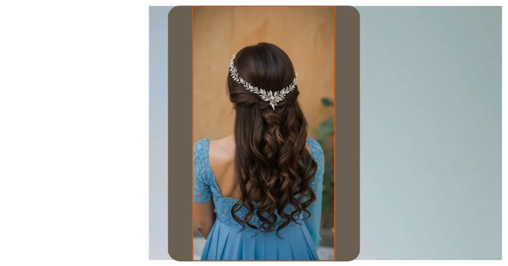 This bridesmaid is rocking a hairstyle that’s both elegant and fun – perfect for a big day like a wedding! Her long hair is styled in a half-updo with soft waves, creating a look that’s both romantic and effortlessly chic. The sparkly headband adds a touch of glitz and glamour, and the overall vibe is totally “I’m here to celebrate!” Who wouldn’t want to look this fabulous as a bridesmaid?