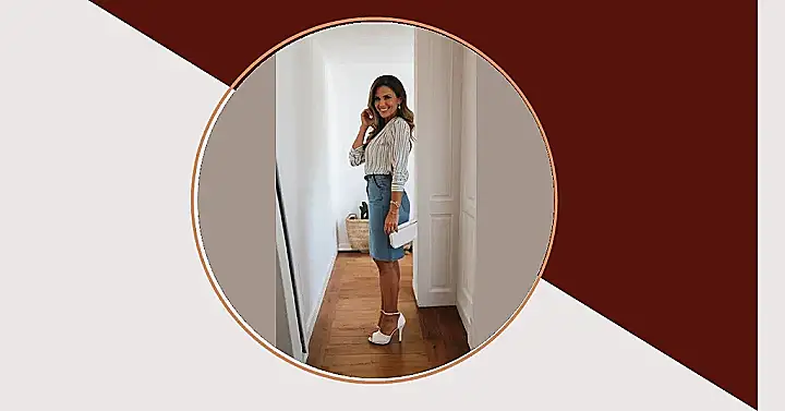 This outfit is proof that moms can rock denim skirts too! The woman in the picture looks super stylish in her striped shirt, denim skirt, and white heels. She’s got that “I’m ready to take on the world” vibe, which is perfect for a busy mom who wants to feel confident and put together. And let’s be honest, those white heels are totally rocking!