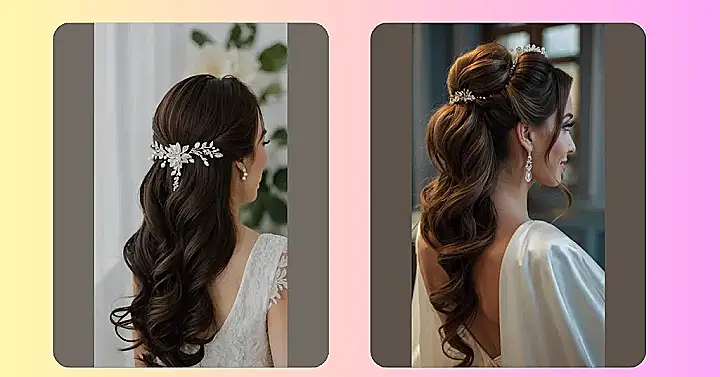 This bride looks like she’s ready to walk down the aisle and say “I do!” Her long hair is styled beautifully with loose waves, and the sparkly headband adds a touch of magic. It’s like something out of a fairytale! This is a perfect example of how a simple but elegant hairstyle can make you feel like a princess on your wedding day.