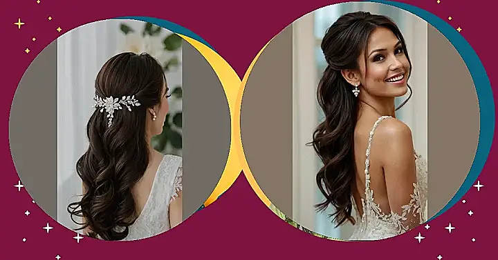 This bride looks like she’s ready to walk down the aisle and say “I do!” Her long hair is styled beautifully with loose waves, and the sparkly headband adds a touch of magic. It’s like something out of a fairytale! This is a perfect example of how a simple but elegant hairstyle can make you feel like a princess on your wedding day.