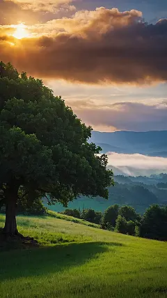 This picture is like a postcard from a super cool place. It’s got this awesome, big, friendly tree hanging out in the middle of a field that’s as green as a giant bowl of spinach. And look! There’s a mountain range in the background, but it’s so far away, it looks like a bunch of green pancakes stacked up in the sky. It’s a little hazy, kind of like when you’re trying to remember what you ate for lunch, but in a good way.