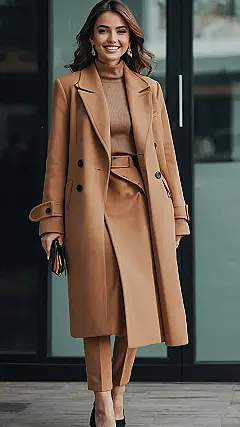 The combination of a long, double-breasted coat with a sleek, fitted pantsuit in a warm brown shade is undeniably chic. This look is perfect for a fancy dinner, a date night, or even a job interview – it’s that versatile. Plus, the whole outfit being a single color gives off a calming vibe that’s sure to turn heads in a good way! This is one outfit that’s sure to make everyone say, “Wow, that outfit is chic!”