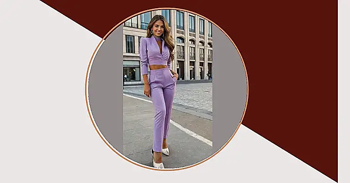This lady is totally rocking the “charming lady outfit” look! She’s wearing a lavender power suit that’s so stylish, it could make even the most boring meeting fun. It’s like she took a page out of a fashion magazine and said, “I’m going to slay!” with a super-cute smile. The cropped top shows off her awesome style and the matching pants make her look super sharp. She’s the queen of “I’m not trying to be noticed, but everyone is going to notice me anyway.”