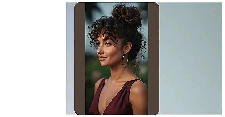 This girl totally rocks her curls! They’re all over the place, but in the best way possible. It’s like her hair decided to throw a party and invited every single curl it could find. She’s got a little bun on top, some loose strands framing her face, and the rest are just hanging out, doing their own thing. Maybe she’s trying to decide what to do with her hair – should she put it all up or let it flow free? Either way, she looks amazing! She’s got a great smile, too. It seems like she’s happy just being herself, and who wouldn’t be with hair this awesome?