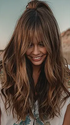 This girl is rocking some serious long hair, and it looks amazing! Her hair is long and flowing, with some fun waves that make it look effortlessly stylish. And those bangs? They’re the perfect way to frame her face and make her eyes pop! Seriously, her hair is goals!