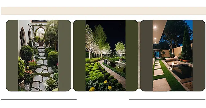 This garden is like a fancy party for your eyes! It’s all about the little details: perfectly shaped bushes that look like they’re wearing tiny hats, fancy lamps that glow softly, and a pathway that whispers “come on in, let’s have a good time.” It’s the kind of place where you can sip lemonade in a fancy dress, even if it’s just a pretend one in your imagination.