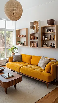 That couch looks like a giant stick of butter, but in the best way possible! It’s the kind of sofa that screams “Netflix binge-watching” or “epic nap,” maybe even both at the same time! You could probably even lose your phone down there, and it would be totally worth it. I also bet this living room makes you feel super calm with all the cute plants on the shelves.