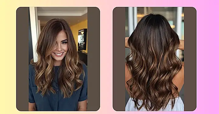 The image shows a woman with stunning, long brown hair that’s full of life. The way her hair is styled gives it a rich, caramel color that’s just begging to be touched. It’s like her hair is a delicious dessert, and the sun is shining down on it, making it even more irresistible! This is the kind of hair color that will make you want to leave your worries behind and just enjoy the warm, cozy vibes of autumn.