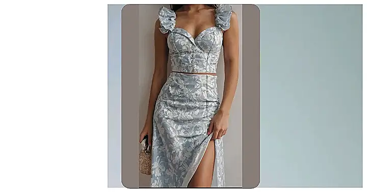 This outfit is like a breath of fresh air – a perfect blend of elegance and whimsy! It’s all about a breezy blue frock, covered in white floral patterns that are super cute and totally on-trend. The top is a little bit fancy with the ruffles on the straps, making you feel like a princess at a garden party. And don’t forget the skirt – the way it flows makes you feel like you’re dancing in a meadow, surrounded by butterflies and sunshine. It’s the kind of outfit that makes you want to grab a picnic basket and head out to a beautiful park!