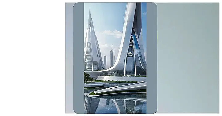 This picture shows a futuristic city with buildings that look like they were designed by aliens! Imagine living in one of those sleek, pointy buildings, zipping around in your flying car. The buildings are so smooth and shiny, they almost look like they’re made of metal. The water reflecting the buildings is a cool touch, like a giant mirror showing off the city’s awesome architecture. It’s a little hard to imagine how people would climb all those stairs though – maybe there are super-fast elevators inside!