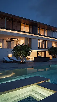 This house is like a scene straight out of a magazine! It’s got all the fancy features you’d expect from a “glamour house”: sleek lines, modern design, and a pool so clear it looks like a giant mirror reflecting the sky. The stairs are a real showstopper, twisting like a ribbon up to the next level. Imagine the feeling of walking up those steps every day, knowing you’re about to enter a luxurious haven!