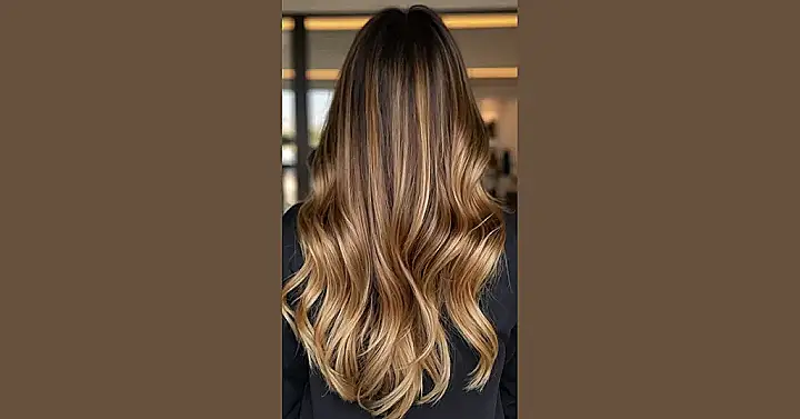 The picture shows a beautiful woman with long, flowing locks. It looks like she just stepped out of a salon, with her hair perfectly styled. This isn’t your average boring brown, though! It’s got a touch of blonde in there, making it what’s called “bronde.” And guess what? The color isn’t just one solid shade. It’s got this cool, trendy “balayage” technique where the hair is painted with different shades of bronde, making it look like sunshine is dancing in her hair. Seriously, it’s like she’s got a built-in spotlight!