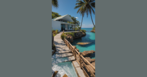 Nestled between the swaying palm trees and the soothing sound of crashing waves, the nautical-inspired porch stands as a cozy retreat along the coastal charm. Adorned with classic navy blue and white striped cushions, complemented by weathered driftwood accents, this porch embodies a timeless maritime aesthetic that beckons you to unwind and relax in style. Anchored by a rustic wooden bench built from salvaged ship planks, the porch exudes a sense of adventure and seafaring romance that transports you to the deck of a grand sailboat, ready to voyage into the sunset.