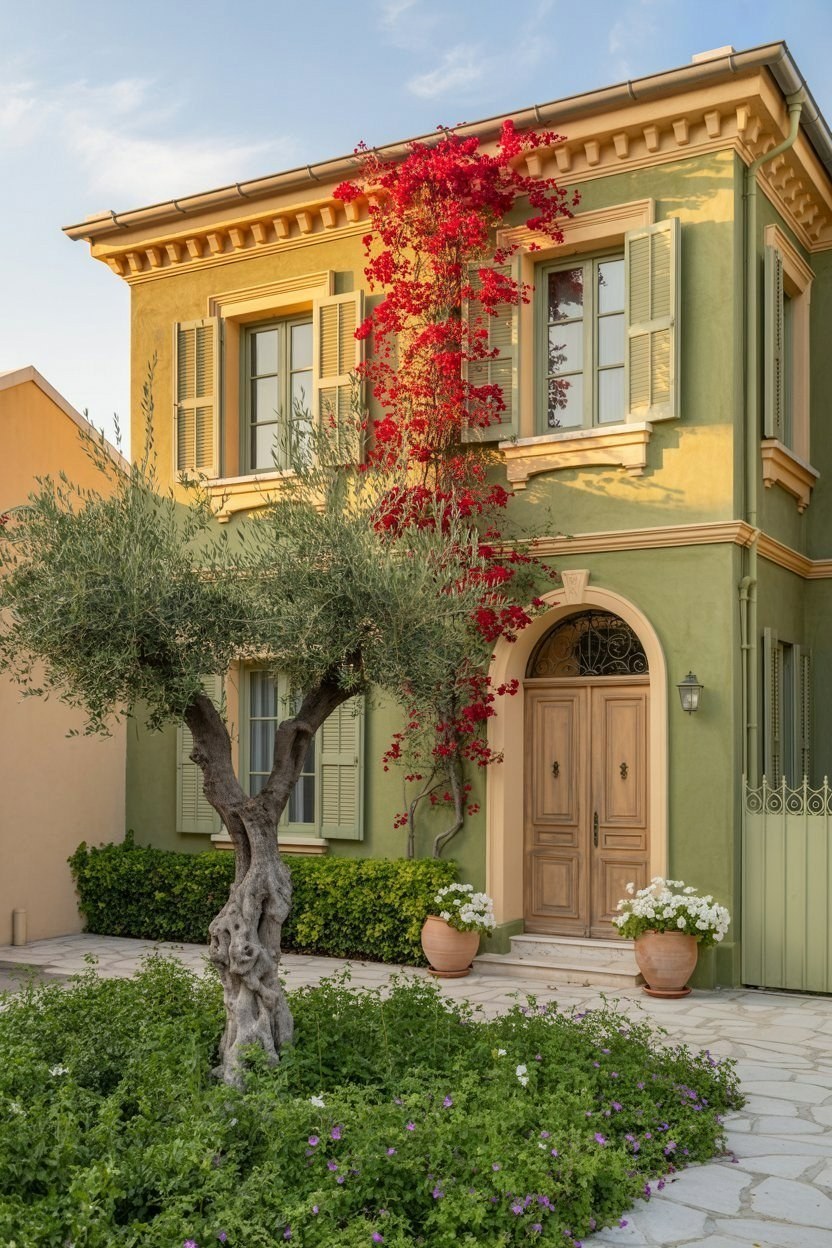 Soft pistachio green meets warm cream in this dreamy green house aesthetic exterior, beautifully complemented by an aged olive tree and vibrant bougainvillea.