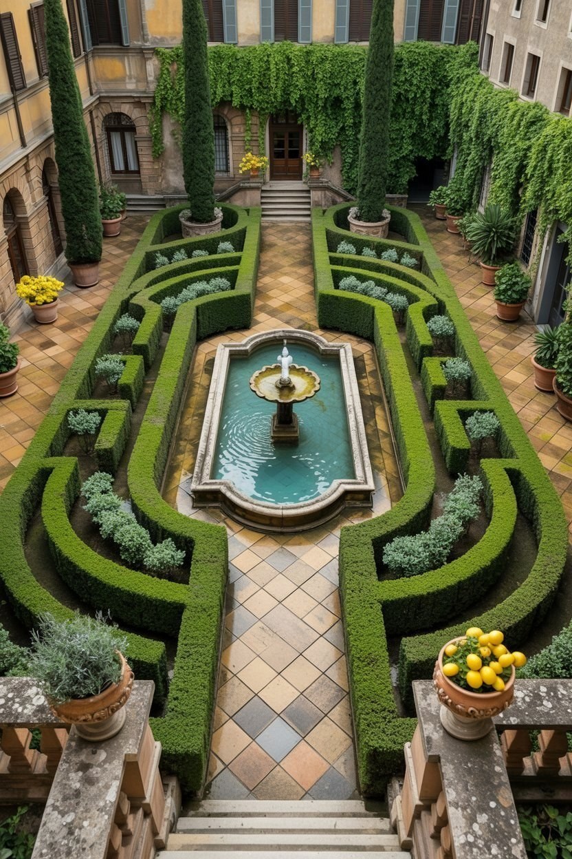 Experience the elegance of Italian courtyard garden design plans, an aerial view of a symmetrical masterpiece anchored by a grand fountain. Clipped hedges frame a shimmering pool, embodying timeless Mediterranean tradition.