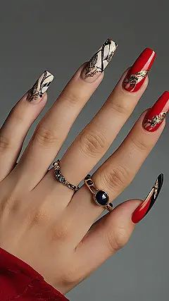 These nails are seriously festive! Imagine showing up to your December holiday party with these gorgeous acrylics. It’s like wearing tiny, sparkly Christmas ornaments on your fingertips! The mix of creamy white and rich red is totally on-trend, and those delicate gold flowers? They’re like a secret sprinkle of Christmas magic. Forget mistletoe – these nails are the real kiss of the season!