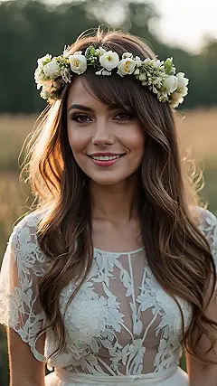 And let’s be honest, that hairstyle is amazing too! Those perfectly messy, slightly curled locks, combined with those cute bangs, are the perfect frame for the flower crown. It’s giving “effortlessly chic,” and honestly, it’s the kind of look that would make even your grandma jealous (in a good way, of course!). This is not just a hairstyle; it’s a whole vibe. It’s the kind of look that says, “I’m getting married, and I’m going to look absolutely fabulous while doing it.”