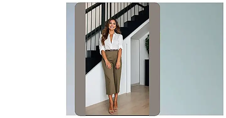 The woman in the photo looks like she’s ready to conquer the world in her chic outfit! She’s rocking a classic white button-down shirt, paired with trendy cropped pants. They’re the perfect mix of casual and professional, like the girl who’s always got her act together but still wants to look super stylish. And those heels? They scream “confidence” and “I’m ready to take on any challenge!”