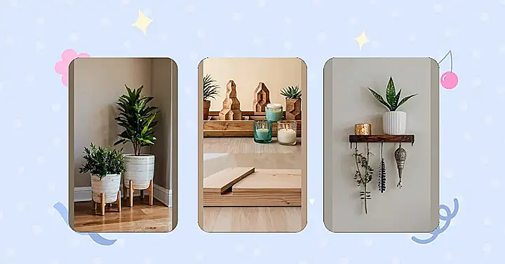 This isn’t your grandma’s corner shelf—unless your grandma’s super cool and into stylish home decor! Check out this awesome wooden number, perfectly showcasing some seriously cute plants. It’s like a mini-zen garden for your room, proving that even small spaces can have big style. Those little succulents and pine cones add a touch of nature’s whimsy, making it the perfect example of how wooden home decor items can brighten up any corner.