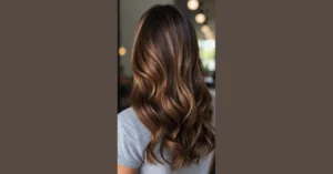 The image shows a woman with stunning, long brown hair that’s full of life. The way her hair is styled gives it a rich, caramel color that’s just begging to be touched. It’s like her hair is a delicious dessert, and the sun is shining down on it, making it even more irresistible! This is the kind of hair color that will make you want to leave your worries behind and just enjoy the warm, cozy vibes of autumn.