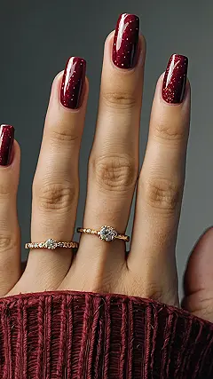 These nails are like a whispered secret – they’re simple, sophisticated, and totally rockin’. That dark red polish is like a little bit of fancy that’s perfect for a night out. And the tiny glitter flecks? They’re like the sprinkles on your favorite cupcake – just enough to make things a little bit more fun. You don’t need a ton of crazy designs or colors to stand out. Sometimes, a little bit of sparkle is all you need to turn heads!