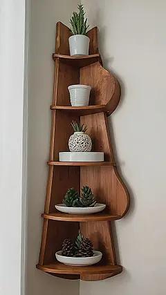 This isn’t your grandma’s corner shelf—unless your grandma’s super cool and into stylish home decor! Check out this awesome wooden number, perfectly showcasing some seriously cute plants. It’s like a mini-zen garden for your room, proving that even small spaces can have big style. Those little succulents and pine cones add a touch of nature’s whimsy, making it the perfect example of how wooden home decor items can brighten up any corner.