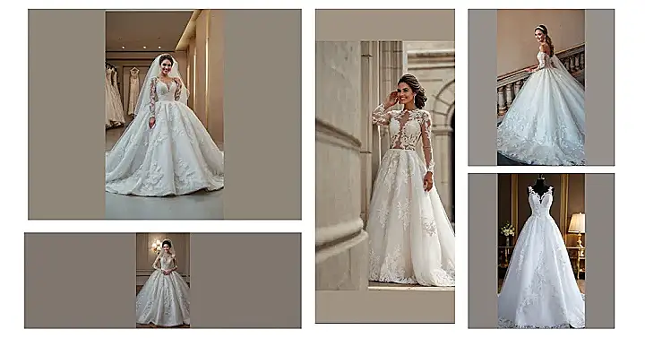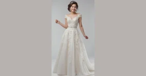 Planning your big day? Don’t forget the most important part – the dress! This one’s got all the princess vibes with its flowing skirt and fancy lace. The bride in the picture looks like she’s ready to waltz straight out of a fairytale. Just imagine twirling around the dance floor in this, feeling like a total queen…with or without a prince!