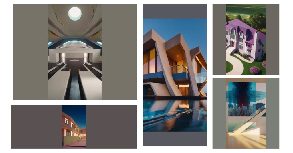 This house is so strange, it looks like it’s about to fall over! It’s got these weird angles and jutting-out parts, like a giant puzzle that someone forgot to put together properly. But even though it looks like it’s about to tip over, it’s actually super fancy, with a big pool that looks like it’s reflecting the house’s crazy design. It’s like the house is trying to escape its own shadow!