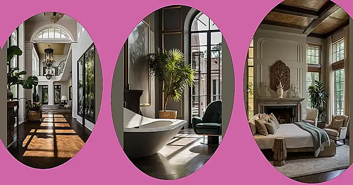 So, this “southern interior” vibe is screaming “fancy,” right? Looks like the kind of place where you’d expect someone to burst out into an operatic aria at any moment. I wonder if the people who live here wear those huge hats and sip sweet tea all day? Maybe they spend their time practicing their scales on that piano or just chilling with that lone plant. One thing’s for sure, that chandelier is ready to drop some serious bling and make your eyes sparkle – hopefully not literally!