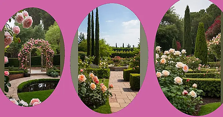 So, you want to create a rose garden that’s not just “blah,” but something truly awesome? Check out this picture! The garden’s got roses popping up everywhere with some super stylish hedges doing their best impression of green Lego bricks. And those tall, skinny trees? They look like nature’s exclamation points, just adding a little “Ta-da!” to the whole scene.