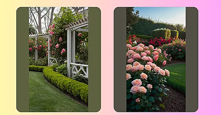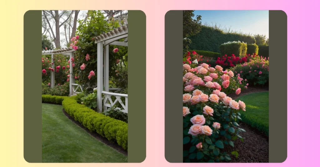 Imagine having a rose garden so pretty it makes you want to write poetry (even if you’re more of a math person). This picture shows a cool design with roses climbing all over a fancy white structure, kind of like a floral jungle gym. Plus, there’s this super neat border of green bushes that’s so straight and perfect it’s almost unreal! It’s basically the chillest place to hang out, read a book, or just watch the bees do their thing.