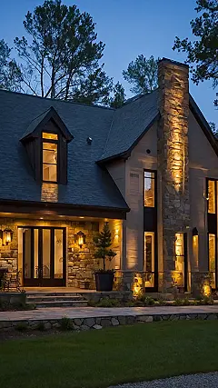 This house is seriously gorgeous! Imagine living here, surrounded by trees and enjoying the cozy glow of the lights at night. It looks like a place where you could have epic movie nights with friends, complete with popcorn and maybe even a scary movie marathon. The stonework is amazing, and that huge chimney just screams “we’re ready for winter!” It’s the perfect blend of rustic charm and modern comfort – basically, a beautiful country home where you could totally rock your pajamas all day long.