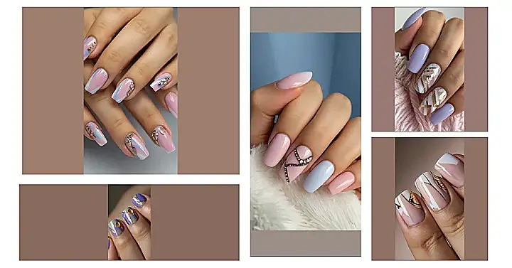 These nails are giving off major “my dad owns a yacht” vibes! The subtle pastel colors are classy, and the sparkly bands across some of the nails make them look like tiny treasure chests. You could totally rock these at a fancy brunch or, like, while casually accepting an award for being ridiculously stylish.
