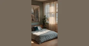 And speaking of chill, check out those artsy pictures on the wall. They’re not flashy, but they’re super classy, right? This bedroom interior design proves you don’t need a ton of crazy stuff to make a space feel awesome. It’s all about simple, comfy, and maybe a little bit green. Now, if you’ll excuse me, I’m going to go adopt a houseplant and pretend I’m a design guru.