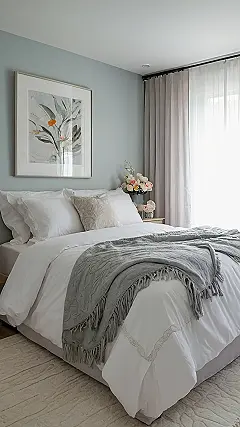 This bedroom isn’t just relaxing; it’s practically begging you to crawl under the covers and hibernate for the rest of the year! The fluffy white bedding looks so soft, you could probably bounce a quarter off it – and who wouldn’t want to spend a day doing that? Seriously though, the light gray throw blanket adds a touch of cozy sophistication, like a fancy, comfy cloud draped over the bed. That gorgeous artwork on the wall? It’s the perfect touch of calm, making sure your dreams are as peaceful as the room itself.