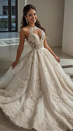 This dress is like something straight out of a princess movie! It’s totally dreamy and romantic, with all that gorgeous lace and the beautiful, flowy skirt. Imagine twirling around at your wedding in this – you’d look like you’re floating on a cloud! The halter neckline adds a modern touch, keeping it from being too over-the-top while still feeling totally bridal. It’s the perfect blend of classic elegance and fun, modern style.