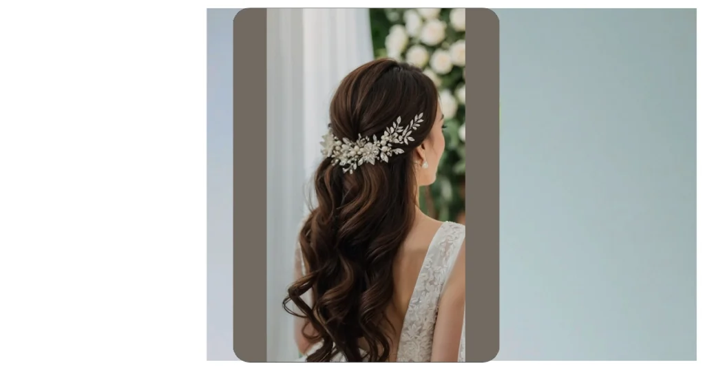 Getting married? Don’t want to choose between an updo and letting your hair flow? This half-up style is like the best of both worlds, kind of like having pizza and ice cream. It’s perfect for showing off your beautiful dress while still letting your hair do its thing. Plus, that sparkly accessory is like the ultimate hair bling, making you look like a total queen on your big day!