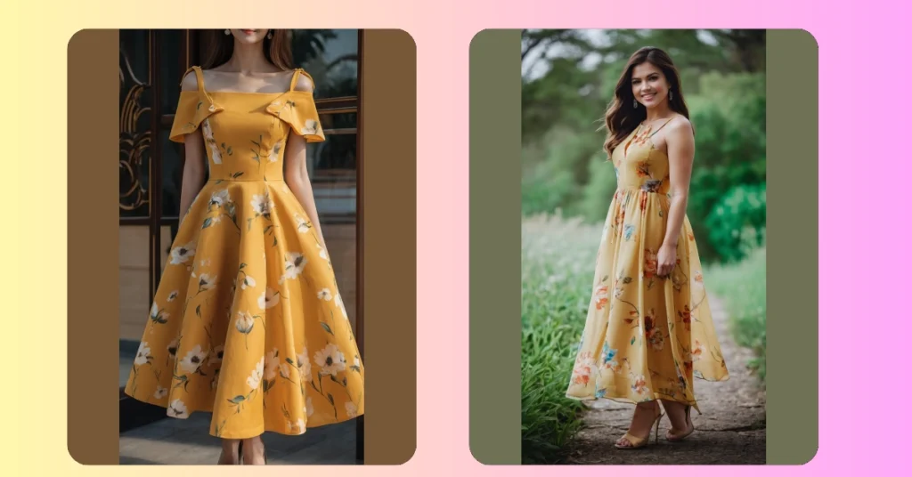 Hey there, fashion friends! Check out this amazing mustard-yellow dress! It’s like a sunny day exploded into a super cute outfit. Those off-the-shoulder sleeves? Totally adorable. And the swirling floral pattern? It’s like a meadow of happiness just waiting to be twirled in. Imagine yourself in this dress at a summer picnic, maybe even sneaking a few extra cookies (don’t tell anyone!). It’s the perfect blend of elegant and fun – you could wear this to a fancy party or just hanging out with your besties. Seriously, it’s so pretty, it could probably make even broccoli taste good!