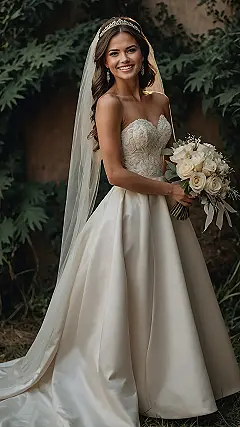 Seeing this gorgeous bride in her ivory wedding dress is like getting a sneak peek into a real-life fairytale. That dress isn’t just white; it’s that soft ivory color, kind of like really fancy vanilla ice cream, but way harder to eat. All that swishy fabric probably feels amazing to wear, though you’d need like a whole crew just to help you walk through doors without getting stuck. It’s definitely got that “wow” factor, making you feel like royalty, or at least someone who can probably trip over their own feet with extra grace while looking fabulous.