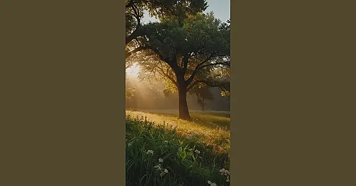 This picture is like a scene straight out of a fairytale! Imagine waking up super early, the sun just peeking over the horizon, painting the sky in shades of orange and yellow. You stumble upon this amazing tree, all majestic and wise-looking, standing in a field of wildflowers. It’s the kind of peaceful, aesthetic nature place you’d find in a dream – a perfect spot to just breathe, relax, and maybe even take a nap under its leafy arms. It’s totally giving off those chill nature vibes!