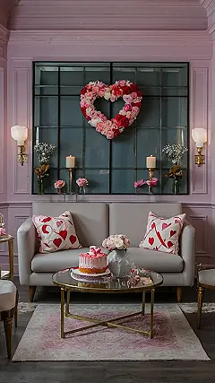 This Valentine’s Day table decor is seriously next level! Imagine snuggling on that comfy couch with your bestie, surrounded by pink pillows patterned with hearts – it’s like a romantic dream, but way less pressure than a real date. That gorgeous heart-shaped wreath above the mirror is the ultimate touch of Valentine’s Day magic. Seriously, who needs chocolates when you have this much pink and romance? It’s giving total “cozy movie night” vibes, perfect for catching up with friends or just enjoying a slice of that delicious-looking cake.