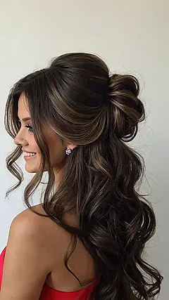 So, you’re thinking of rocking the ‘down hairstyles for prom’ look, huh? Smart choice! This half-up, half-down style is like saying, “Yeah, I’m fancy, but I also came to dance!” It’s the perfect mix of chill and chic, meaning you can slay the dance floor without your hair getting all tangled and sweaty. Plus, it’s like having the best of both worlds: you get to show off your gorgeous curls and have some hair out of your face. Win-win!