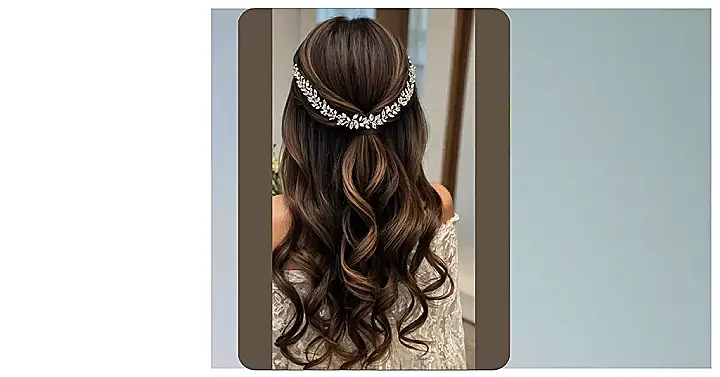 Choosing this hairstyle is basically the cleverest move ever for a wedding! You get all the benefits of having hair mostly out of your face, so wind gusts or enthusiastic hugs won’t turn you into a tangled mess. Yet, you don’t miss out on the fun, bouncy volume that having hair down gives you. It’s the ultimate balance! The accessory just ups the ante, making it sparkle like a fairy tale while keeping everything perfectly in place so you can focus on important stuff, like not tripping down the aisle or figuring out how to dance in heels.