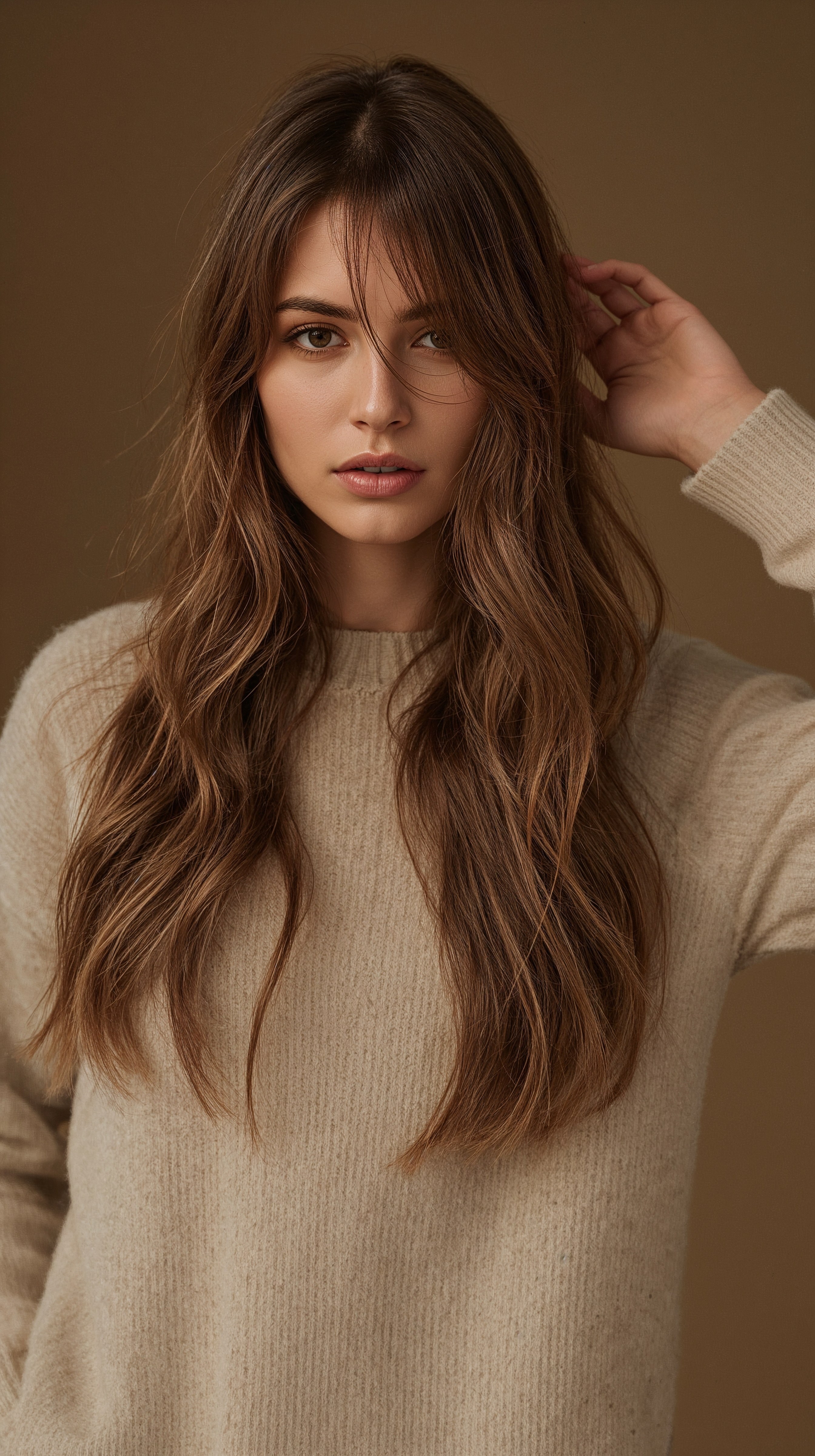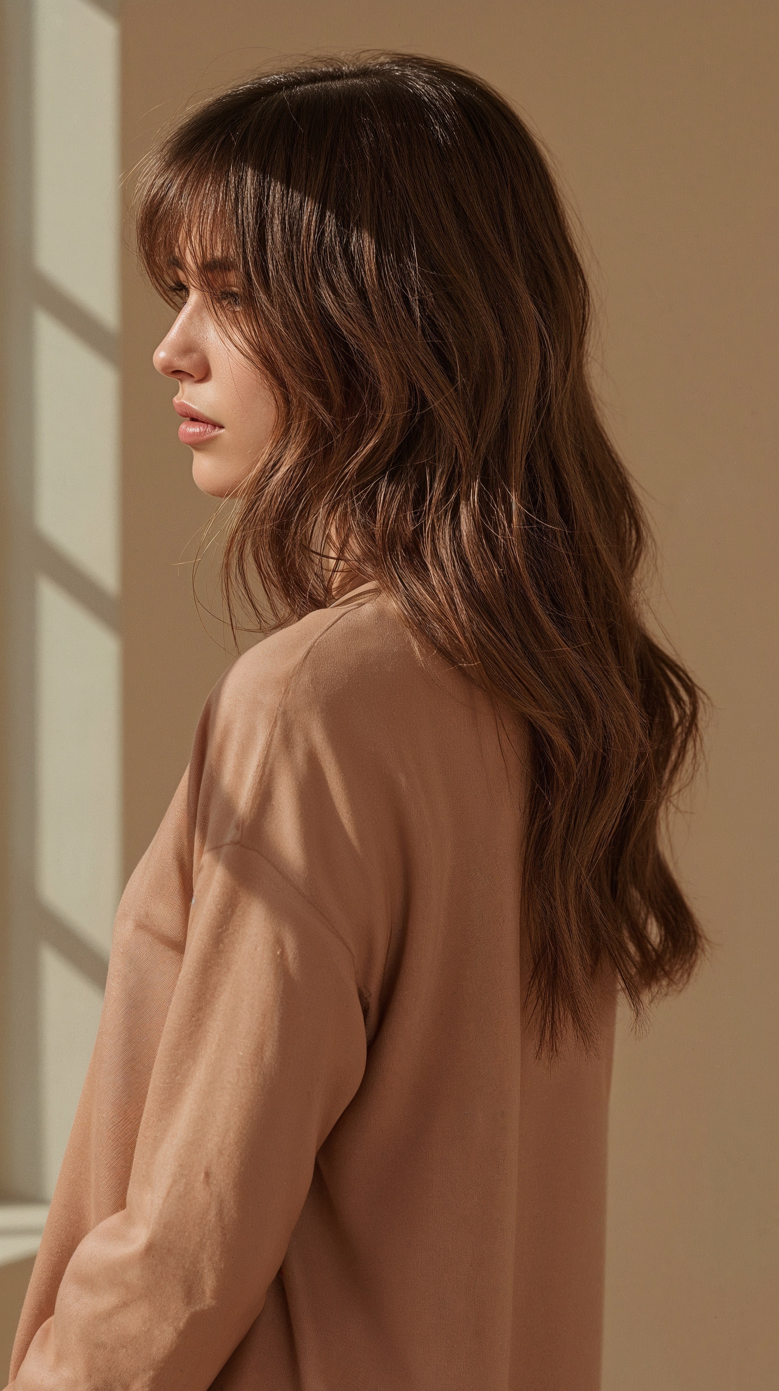 #2 Trendy Long Brunette Haircuts with Face-Framing Bangs for 2025