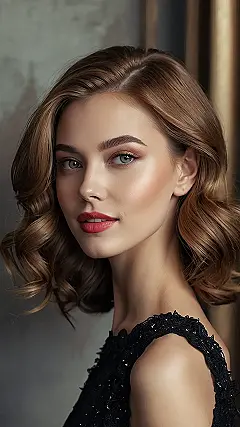 This hairstyle is seriously elegant! It’s like a perfect blend of old Hollywood glamour and modern chic. Imagine yourself at a fancy party – this medium-length, wavy look would totally make heads turn. It’s got that classic vibe, but it’s not too stuffy; it’s easy-going enough for everyday wear too, if you’re feeling extra fancy. Seriously, it makes this model look like she’s ready to accept an award for “Most Stunning Hair Ever.”