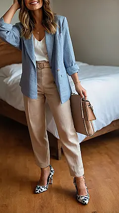 This whole look with the cool blue blazer and comfy pants is the ultimate “I tried, but not *too* hard” vibe. It’s like saying, “I know how to dress, but I also appreciate breathing room.” You can walk into a room feeling totally put together, yet secretly plotting your next snack break. It’s the grown-up version of looking sharp for school pictures but still being able to ditch the tie the second the photographer leaves.