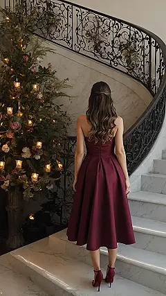 Who knew a dress could make you feel like you’re about to walk into a movie scene? This amazing burgundy evening dress with its flowy skirt and cool strapless style just screams “fancy night out.” She’s got the perfect matching heels, probably spent a good hour making sure her hair was just right, and is now ready to conquer those grand marble stairs. Looking this good takes effort, but a slight wobble while trying to look effortlessly chic is just part of the whole glamorous adventure, right? It’s all about rocking that “I woke up like this, but actually spent two hours getting ready” vibe.
