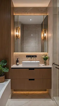 Stepping into this bathroom is like accidentally walking onto a movie set for a very fancy commercial, but for your daily routine! All the gleaming gold on the faucets, the mirror frame, and even those sleek light strips just scream “VIP treatment.” Forget boring old mornings; in a space like this, even brushing your teeth would feel like a red-carpet event, making you wonder if your toothpaste should come with a tiny velvet pouch. This isn’t just bathroom interior design; it’s a personal glow-up station, ready to make you shine brighter than those stunning vanity lights.