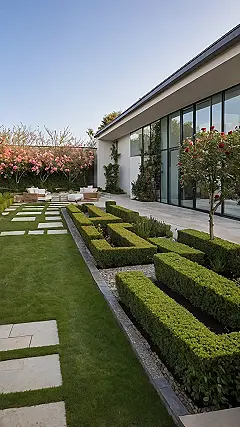 And if those geometric green hedges weren’t cool enough, check out that gorgeous rose tree, popping with vibrant red flowers right by the house, like it’s throwing a party just for your eyes! With the comfy-looking outdoor couches and those beautiful pink flowering trees in the background, this isn’t just a pretty view – it’s a full-on rose garden experience that doubles as an outdoor living room. Imagine chilling here after school, soaking up the sun, and probably making every other front yard on the block super jealous.